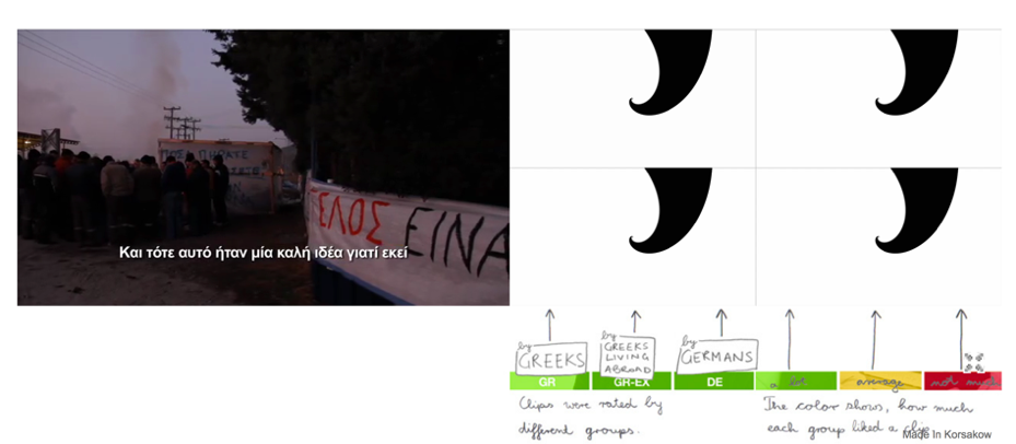 Florian Thalhofer’s Money and the Greeks(2013), on the other hand, attempts to integrate the underlying principles of democracy into the production process itself. It does so by involving the audience in editorial decisions both on site and online, where they rate the material and decide what stays, what goes, and what deserves further development. Using video vignettes in a nonlinear navigation interface, and interrogating various aspects of the economic crisis in Greece, the project solicited input from three groups of participants: Greeks, Germans, and the Greeks living abroad. The resulting video tapestry is a consensus of sorts, but each clip is colour-coded to indicate how the three participating groups responded to its content (like/dislike/neutral). An experiment in collective decision making, the project allows for varied interpretations of its content. It also questions the very concept of democratic consensus, its meaning and merit in times of crisis.
